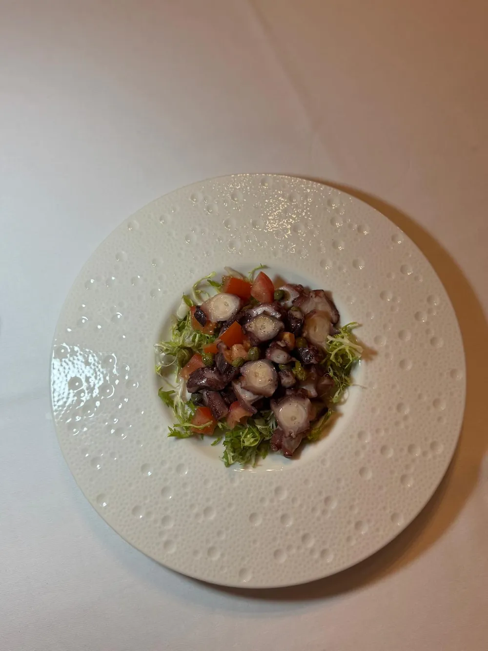 hobotnica sjeckana na kolutiće, začinjena vinskim octom i domaćim maslinovim uljem uz sitno nasjeckane rajčice