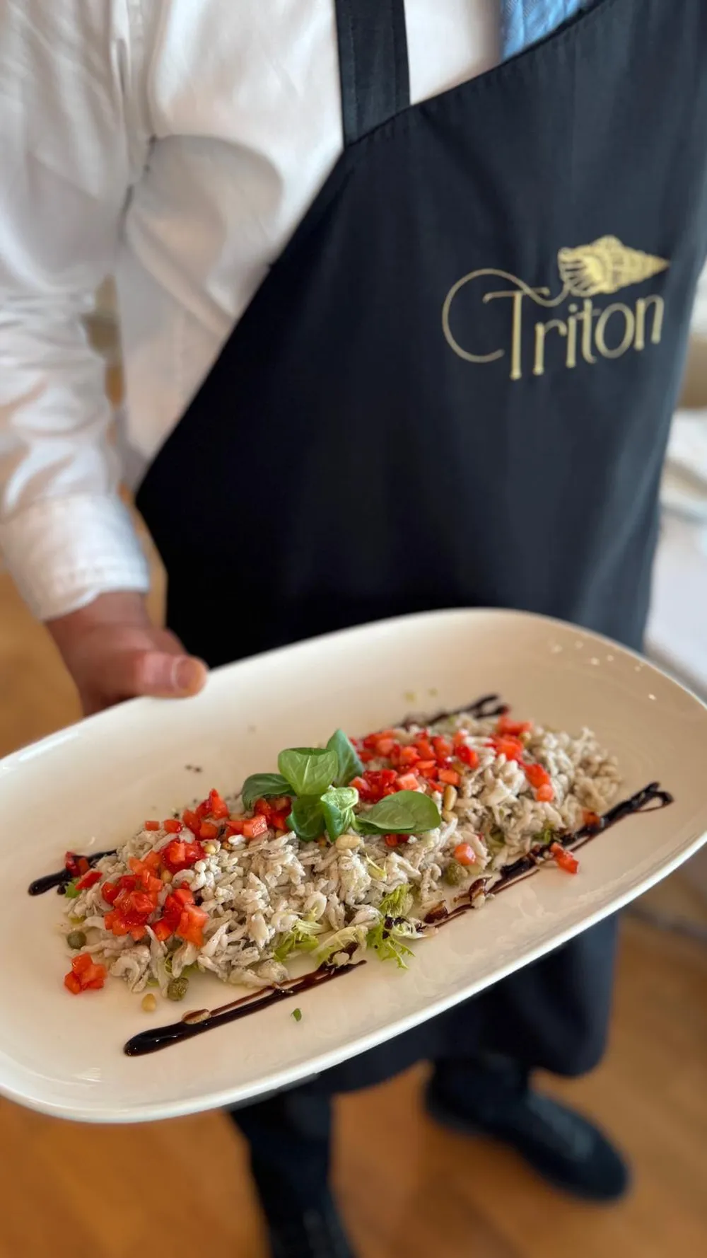 meso plavog raka začinjeno vinskim octom i domaćim maslinovim uljem sa mješavinom sezonskih salata